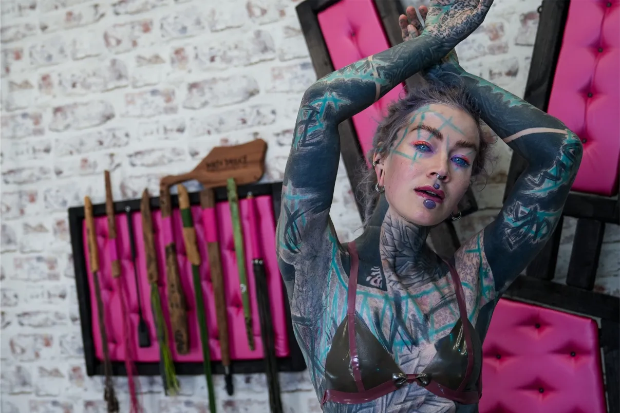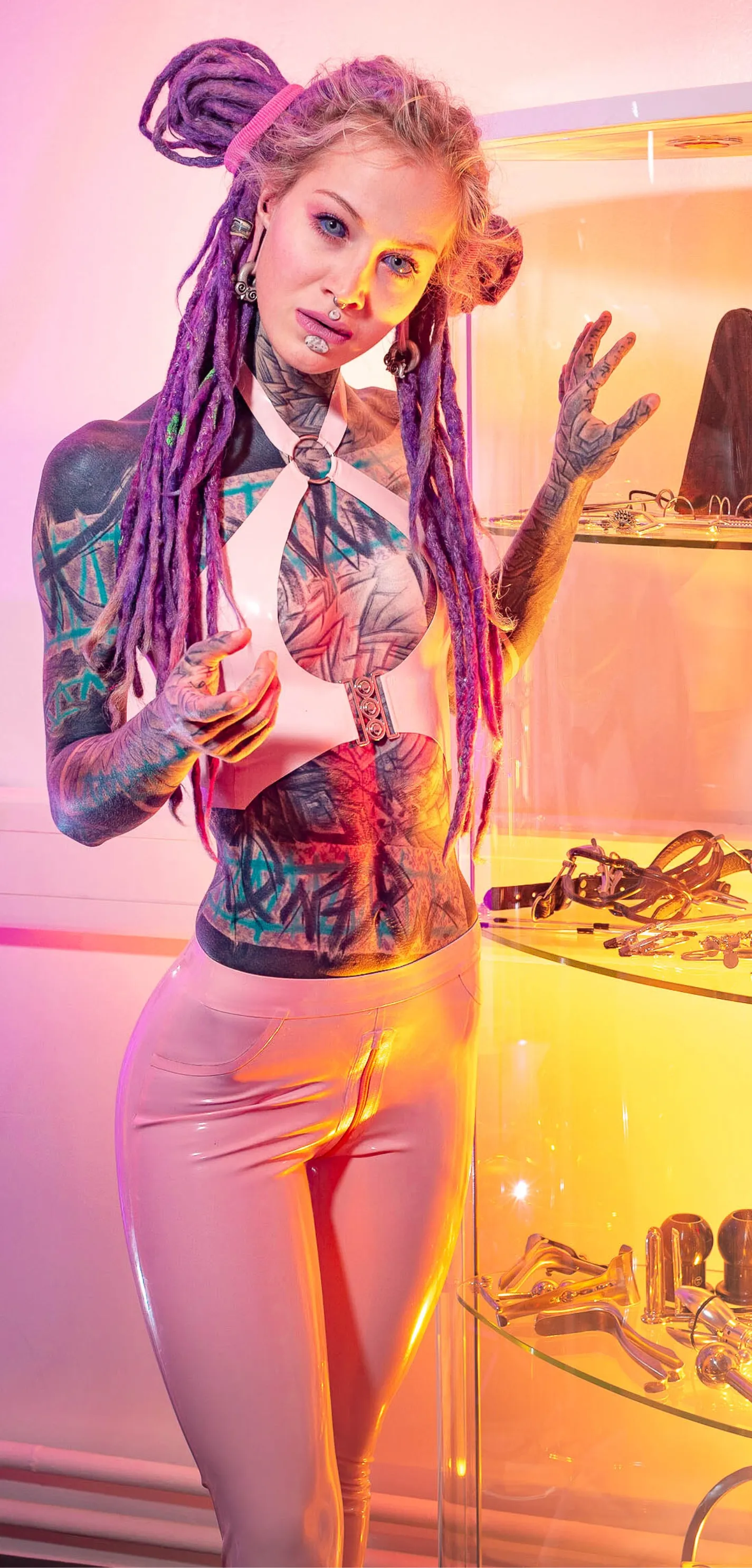 I am in awe of Anuskatzz and the way she raises the bar for alternative. She is a quintuple threat, camming, modeling, domming, producing content which plays at erotic film festivals, and participating in the most extreme erotic live shows on the planet. She views her work as falling some place in between “psychedelic art and pornography.” From the way her ink flows artistically all over her body to her big dreads, Anuskatzz has beautiful style. She is not just a pinup, but a genuine lifestyle alt girl willing to explore extremes where others fear to tread. (ALTSTAR MAGAZIN 2019)